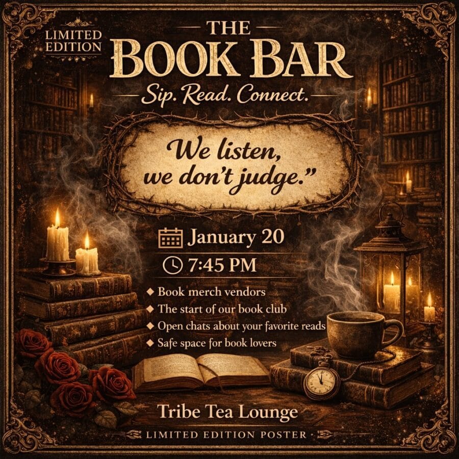 Join us January 20th at 7:45 PM at Tribe Tea Lounge for an intimate night made just for book lovers β˜•πŸ“–