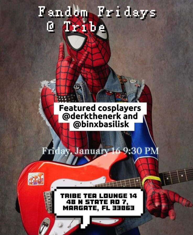 Come out this Friday and catch the amazing @derkthenerk and @binxbasilisk lighting up the night at @tribetealounge πΈπ·οΈFandom Fridays just hit differentβcosplay, music, and vibes you donβt wanna miss! π Location Tribe Tea Lounge1448 N. State Rd, Florida 33067π€ 9:30 PM #flcoaplay #cosplay #dj #spiderman #tomiejunjiito #fandomfridays