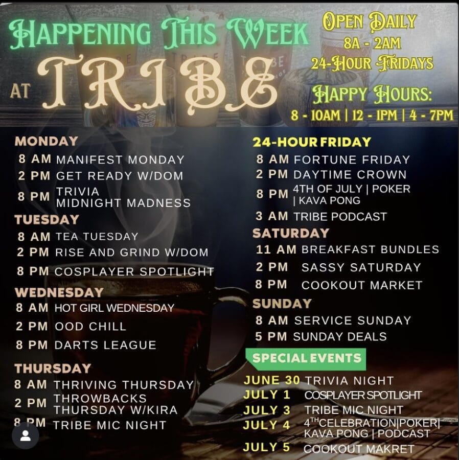 ![]() ☕✨ HAPPENING THIS WEEK AT TRIBE ✨☕Open Daily: 8AM - 2AM📍 24-Hour Fridays💸 Happy Hours: 8-10AM | 12-1PM | 4-7PM MONDAY8AM – Manifest Monday2PM – Get Ready w/ Dom6PM – Book Club8PM – Trivia⏰ Midnight Madness TUESDAY8AM – Tea Tuesday2PM – Rise and Grind w/ Dom8PM – Cosplayer Spotlight WEDNESDAY8AM – Hot Girl Wednesday2PM – […] |